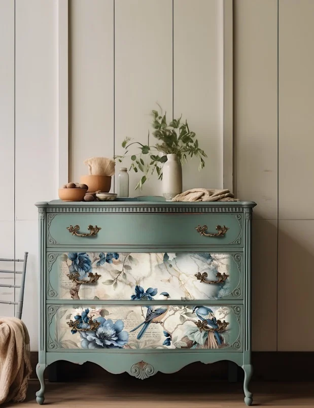 Jednoduše decoupage paper vložte do mokrého laku na kusu nábytku a poté znovu přelakujte 🙂