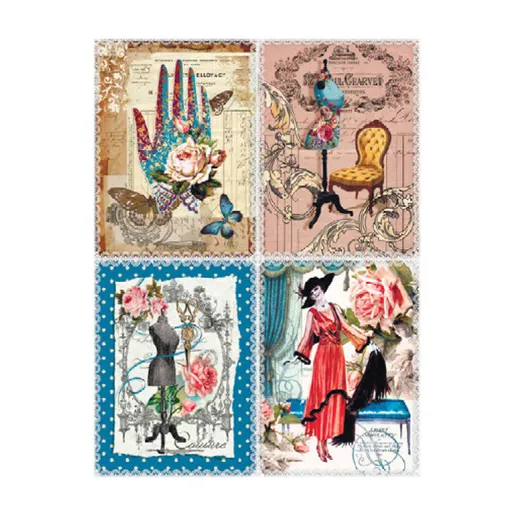 Lehký, jemný, ale zároveň pevný papír ideální na decoupage. Rýžový papír  je mírně průhledný a zblízka jsou v něm viditelná rýžová vlákna. Papír tak získává na omak jemnou strukturu.
