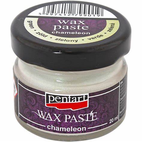 Vosková pasta (Chameleon wax paste) se základem včelího vosku a pomerančového oleje vytvoří na tmavém povrchu měnící se kovový třpytivý efekt, na bledém podkladu vytvoří krásně měnící se odlesky. Voskovou pastu naneste v tenké vrstvě a rovnoměrně ji rozetřete na předmět, který byl již zdoben, resp. natřený barvou. Pasty můžete nanášet i tak, aby se prolínaly a vytvořit tak zajímavé třpytivé efekty bez viditelných přechodů. Celková doba schnutí pasty je cca 3 hodiny.